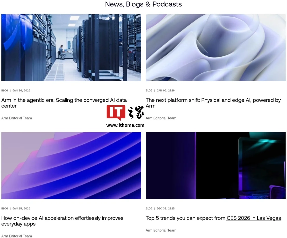 IT之家留意到,Arm官网新闻室首页呈现的博客同样围绕数据中心、边缘计算、物理AI这三大主题,每个主题各有一篇。
