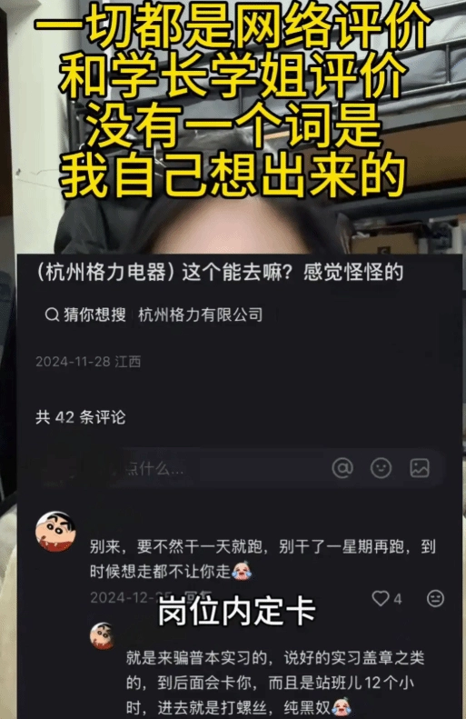 原来,10月29日那天,这位女大学生所在的学校组织学生前往浙江工业大学参加校招双选会。活动期间,她加入了格力电器杭州有限公司储备干部的招聘群。到了10月30日,该招聘群开启了腾讯会议形式的线上视频宣讲,会上提到所有实习生都需要先到一线岗位工作三个月,对此她表示能够理解。