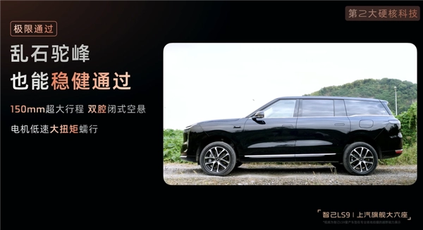 最后,LS9搭载了双腔闭式空气悬架系统,其行程最大可达150mm,当悬架升至最高位置时,车辆能具备与硬派越野车相当的通过性能;再结合电机低速高扭矩的特点,即便是面对乱石路段和驼峰桥,也能轻松通过。
