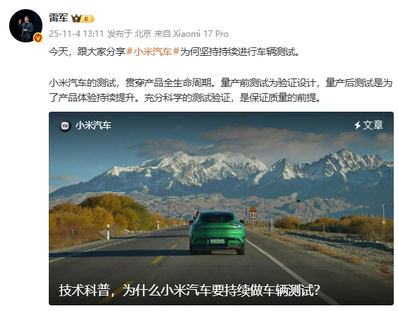 11月4日消息,最近小雷刷到不少网友吐槽:“小米SU7和YU7都上市挺久了,怎么还能在全国各地看到测试车呢?”小雷之前其实也对这事感到好奇,直到看了雷军最新发布的视频和微博内容,才算把这件事彻底弄明白。