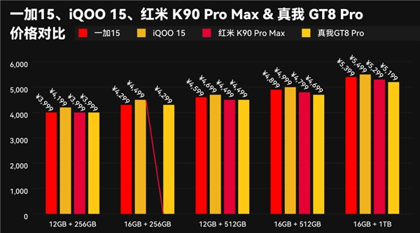 你们看,12GB+256GB 这个版本,无论是红米、一加还是 iQOO 都选择 2599 元起售,价格拉不开差距。