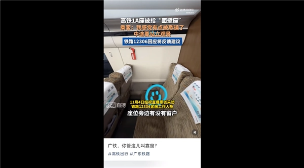 11月5日消息,近日有网友在社交平台发帖抱怨,自己购买的高铁靠窗座位实际是“面壁座”,此事随即引发了众多网友的热烈讨论。