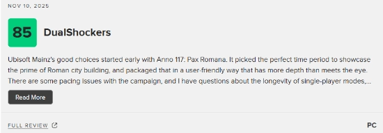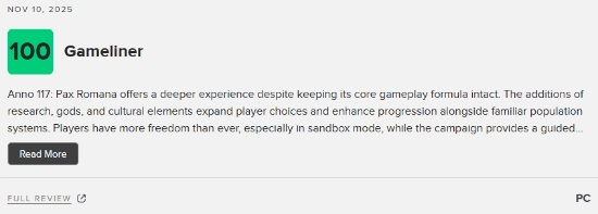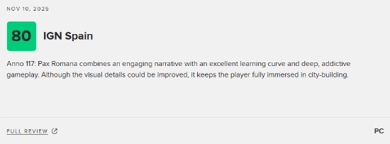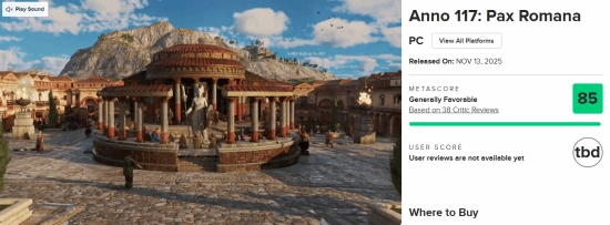 《纪元117:罗马和平》作为育碧推出的全新策略模拟游戏,计划于11月13日正式发售,并且首发阶段就会提供中文配音服务。截至目前,该游戏在M站的媒体评分已经正式公布: