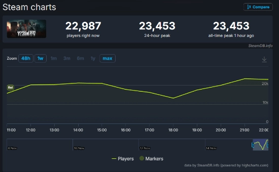据数据统计网站SteamDB,截至目前,《逃离塔科夫》steam评价获“差评如潮”,同时,steam玩家最高在线仅破两万人。