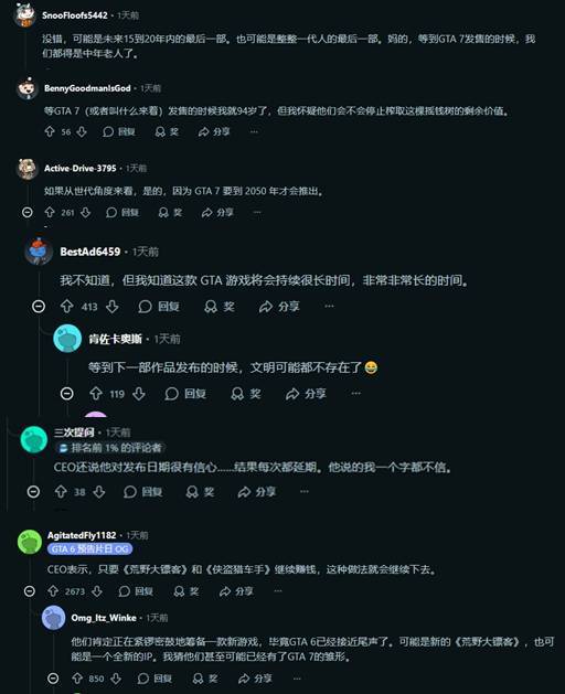 尽管玩家之间存在不同看法,但多数人依然相信《GTA》系列不会就此画上句号。只是,等待下一部作品的过程,或许会比大家预想的更加漫长:“这绝不是终点,但《GTA7》怕是得等上十年,甚至更久。”“我敢断言《GTA6》的活跃周期会特别长,说不定比前作还要夸张。”“等下一部作品公布的时候,说不定连文明是否延续都成问题了。”“等到《GTA7》发售那天,我们这一代玩家恐怕都已经步入中年了。”