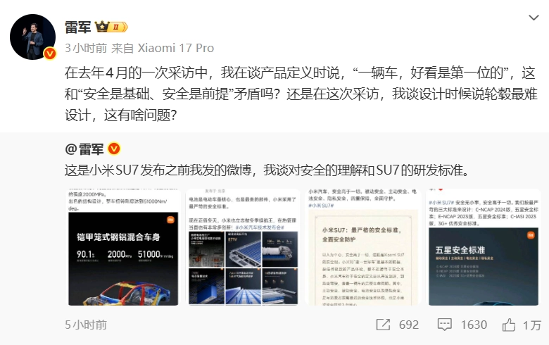 梳理这些两年前的公开信息不难发现,雷军当时多次强调安全是汽车的首要前提,与当前质疑形成鲜明对比。