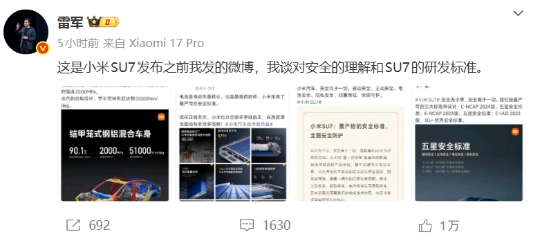 关注过小米相关舆论动态的人应该都清楚,这并非雷军首次为品牌发声澄清。自小米SU7上市以来,其市场占有率实现快速增长,对同级别竞争车型构成了一定的市场冲击。在此之后,网络上逐渐涌现出针对SU7的各类负面讨论:其中包括对车辆“过于注重设计而忽视安全性能”的质疑,也有对个别车主因操作不当导致事故的过度渲染,更有甚者还出现了“绿化带战神”这类带有调侃性质的负面标签化称谓。
