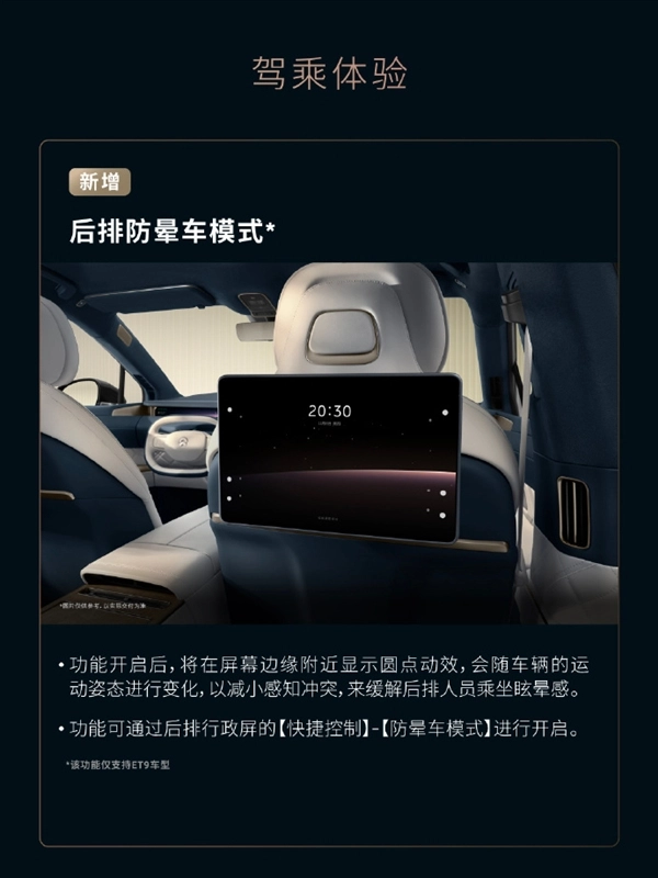 另外,还新添了“后排防晕车模式”,开启该模式后,屏幕边缘会呈现出随车辆姿态改变而变化的圆点动态效果,借助减少感知冲突的方式来减轻眩晕感。