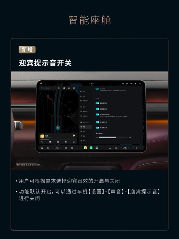 “迎宾提示音开关”赋予了用户自主选择的权利,用户能够通过车机设置,对默认开启的迎宾音效进行自由的开启或关闭操作。