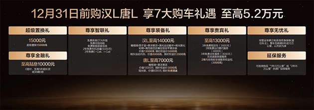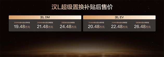 此次,汉L EV推出3款车型,补贴后的售价区间为20.48万至26.48万元;汉L DM同样提供3款车型,补贴后售价在19.48万到24.48万元之间;此外,比亚迪还为用户准备了包含置换补贴在内的至高价值5.2万元的尊享礼遇(上述权益有效期截至12月31日)。