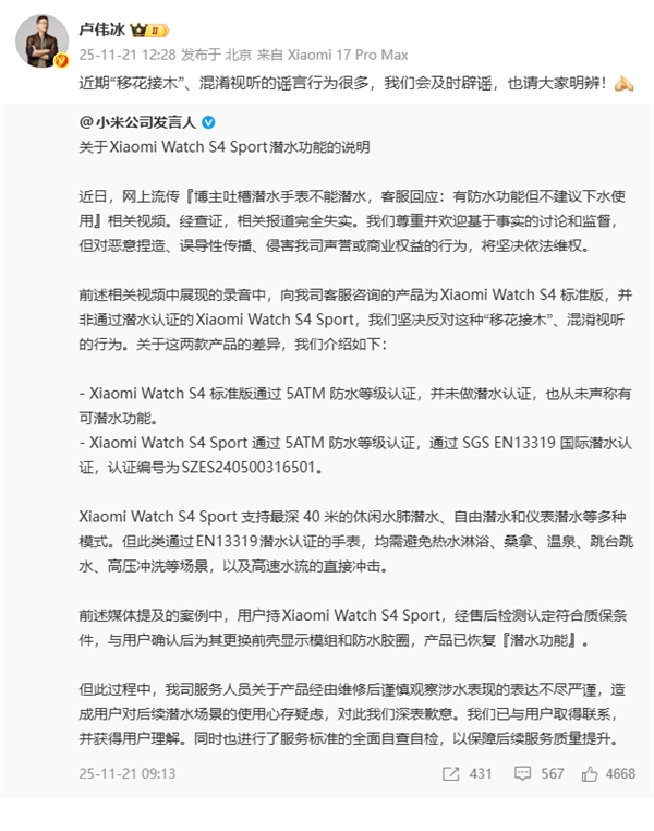 这段录音实际询问的是Xiaomi Watch S4标准版产品,而非具备潜水认证的Xiaomi Watch S4 Sport款;前者本身未进行潜水认证,也从未宣称拥有可潜水功能。