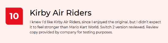 Switch 2平台的竞速新作《星之卡比:天空骑士》已于11月20日正式推出,国外媒体siliconera对该作品给出了满分10分的高度评价。