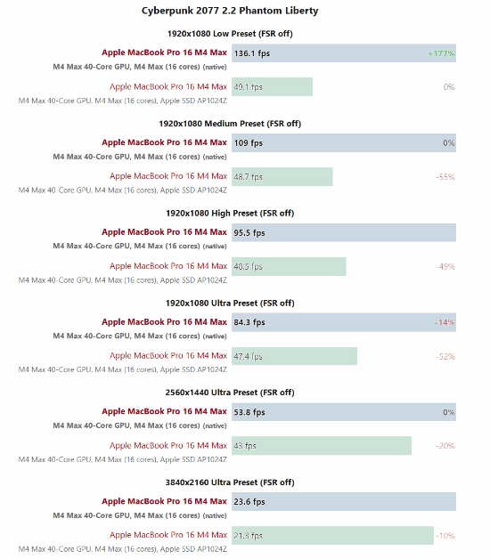 测试结果显示,MacBook Pro 16运行《赛博朋克2077》原生版本时,性能比之前用CrossOver模拟运行的版本提升了68%之多,特别是在1080p和QHD分辨率下,性能提升的效果尤为显著。