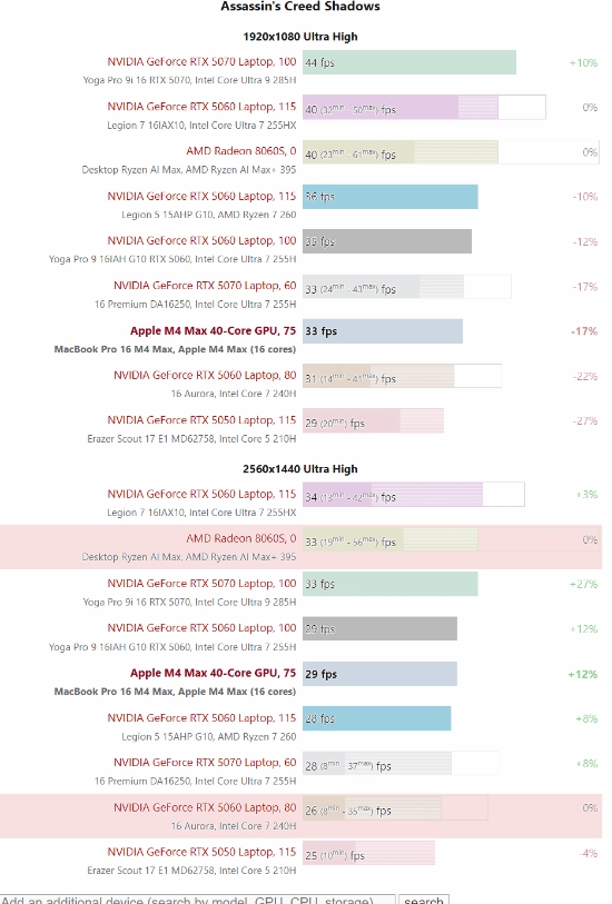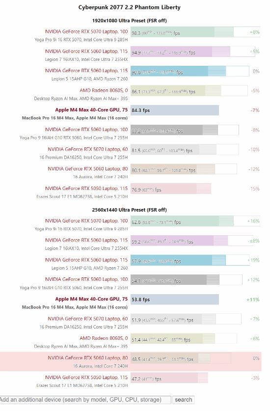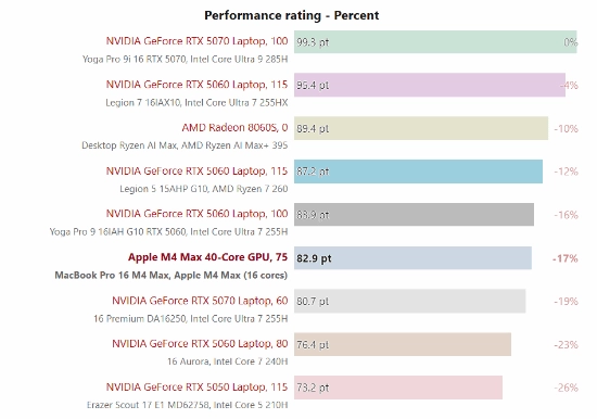 不仅如此,M4 Max的性能表现甚至能够超越部分低功耗版本的RTX 5070移动显卡,像戴尔16 Premium笔记本中所配备的60瓦RTX 5070就属于这类被其击败的型号。