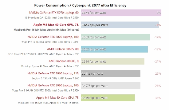 在能效测试环节,《赛博朋克2077》原生版本的运行效率比模拟运行版本高出46%;而在游戏能效表现上,搭载苹果M4 Max芯片的设备,相较于性能处于同一梯队的Windows笔记本,几乎战胜了所有同类型竞争对手。