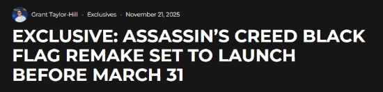 《刺客信条:黑旗重制版》是系列粉丝们翘首以盼的作品之一,不过官方至今尚未正式确认这一作品的存在。今天,外媒Insider Gaming带来独家消息,证实该重制版预计会在2026年3月31日之前推出。