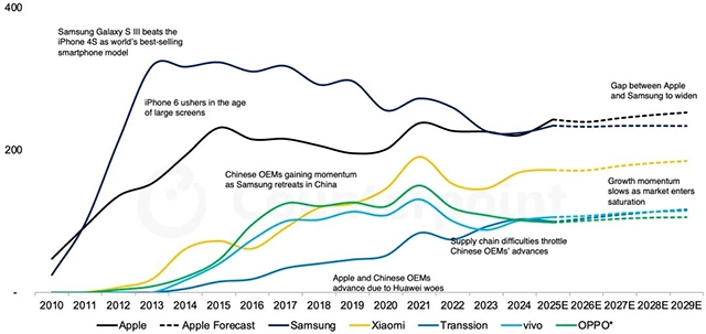 市场研究机构Counterpoint Research发布的《智能手机市场展望追踪》报告指出,苹果或将在2025年迎来历史性跨越。本年度iPhone全球出货量预计为2.43亿部,凭借19.4%的市场份额超过三星(其出货量预计2.35亿部,份额18.7%),跃居全球智能手机品牌榜首。这是苹果自2011年之后,首次在年度出货量上赶超三星,并且预计这一领先态势将延续至2029年。