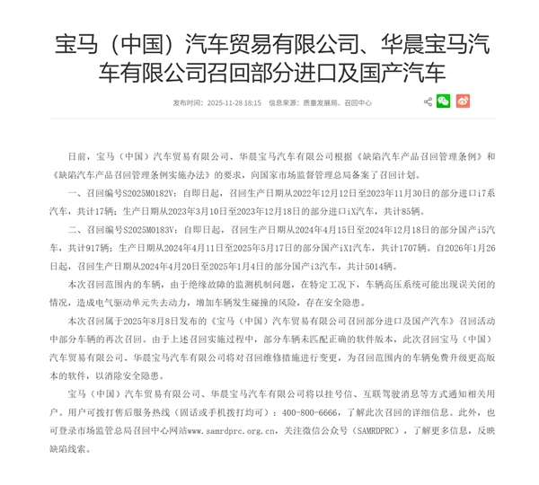 自即日起,召回生产日期在2022年12月12日至2023年11月30日期间的部分进口i7系列汽车,涉及数量为17辆;同时召回生产日期介于2023年3月10日至2023年12月18日之间的部分进口iX汽车,涉及数量为85辆。
