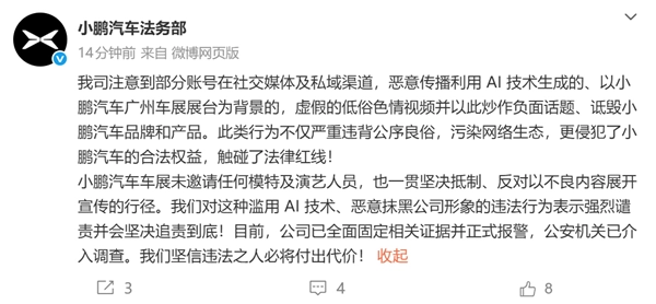 11月28日,小鹏汽车法务部发布声明表示,公司发现有部分账号在社交媒体及私域平台上,恶意传播通过AI技术生成、以小鹏汽车广州车展展台为场景的虚假低俗色情视频,借此炒作负面话题,对小鹏汽车的品牌与产品进行诋毁。