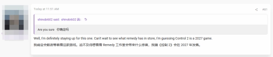 事情的起因是Reset Era论坛上有位用户分享了自己的预测,他觉得目前讨论《控制2》还太早,理由是Remedy可能正在重制《马克思佩恩》的前两部作品,不过《控制》的衍生电视剧倒是有一定可能性。