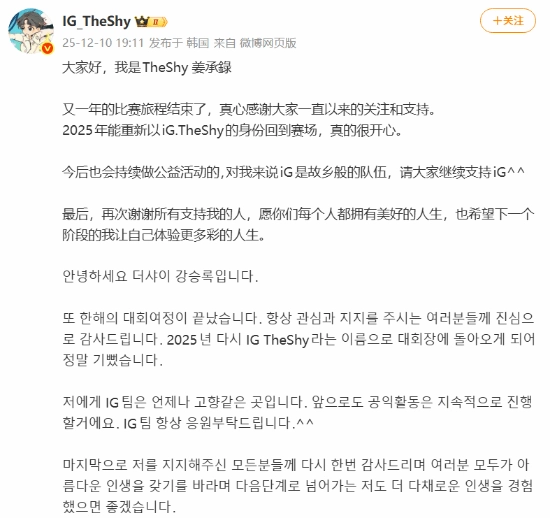 2025年能重新以iG.TheShy的身份回到赛场,我确实非常高兴。